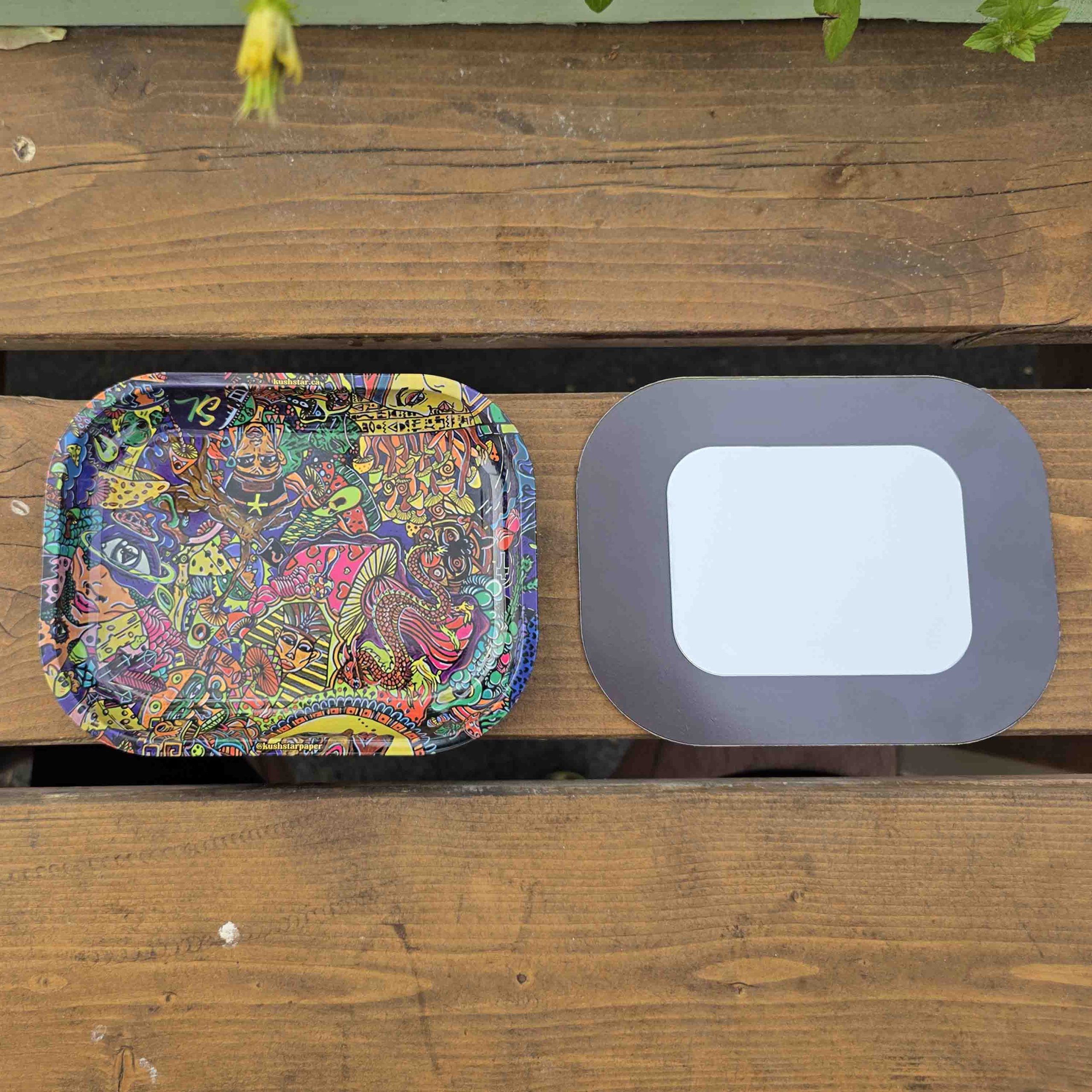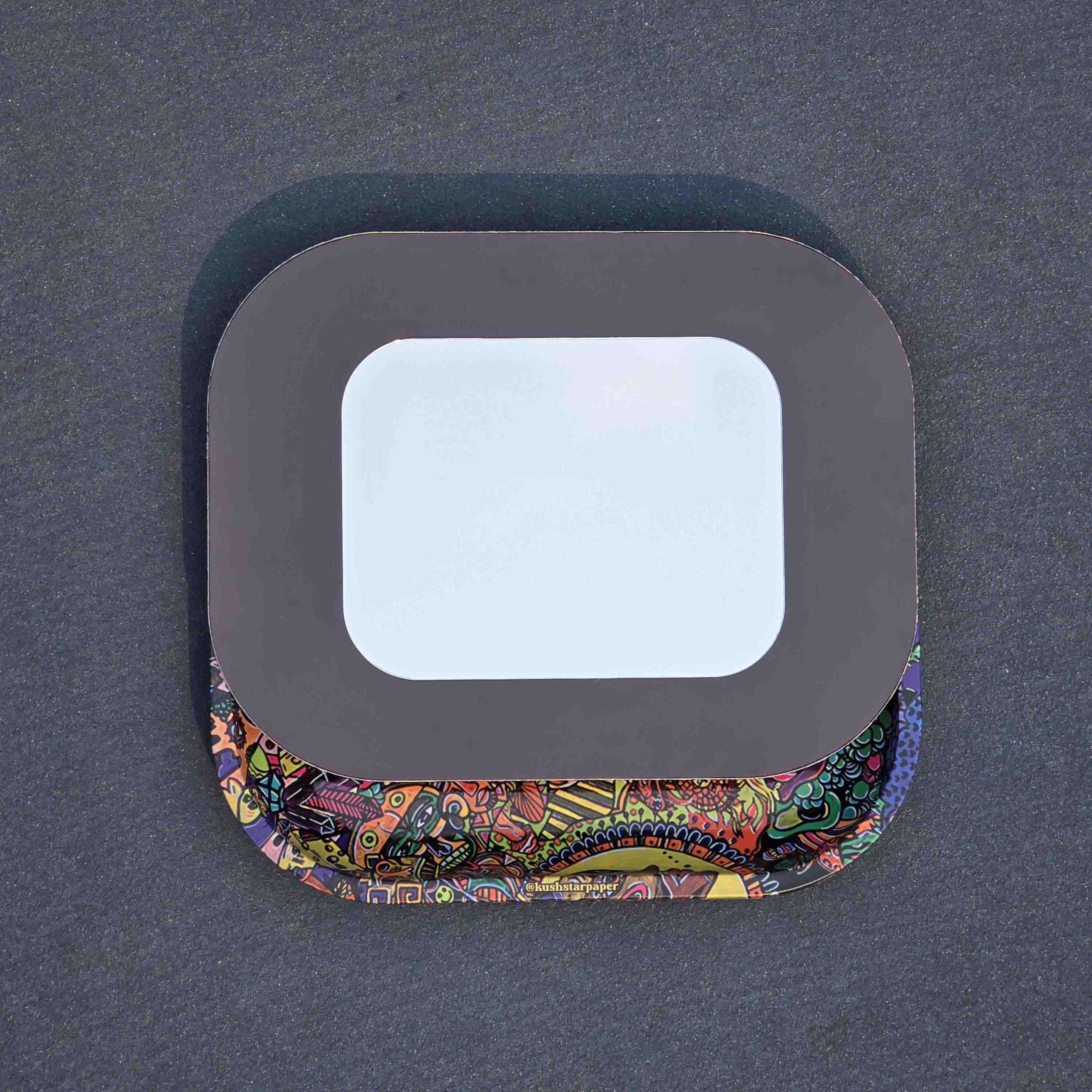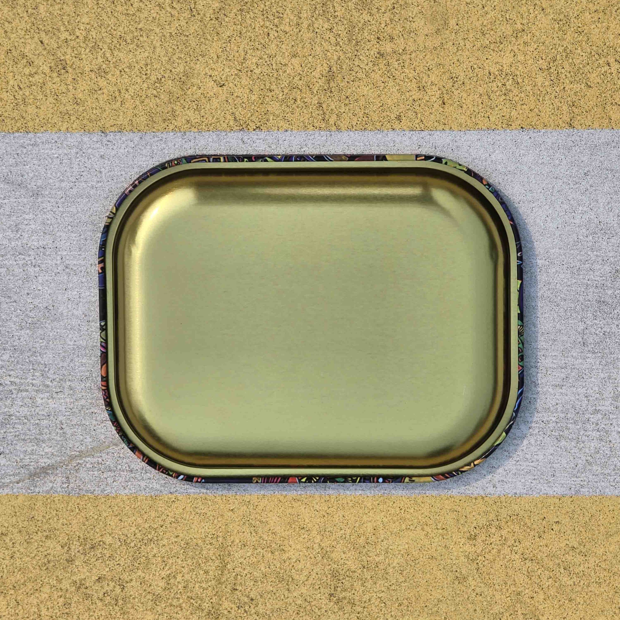 This 18×14 cm size hard magnetic lid thick rolling tray is the perfect carry on size type of tray. You can leave it in the living room, kitchen or whichever place you forgot, since the last time you were stone and don’t remember. For us it represents the colors of the connection the real and the surreal.